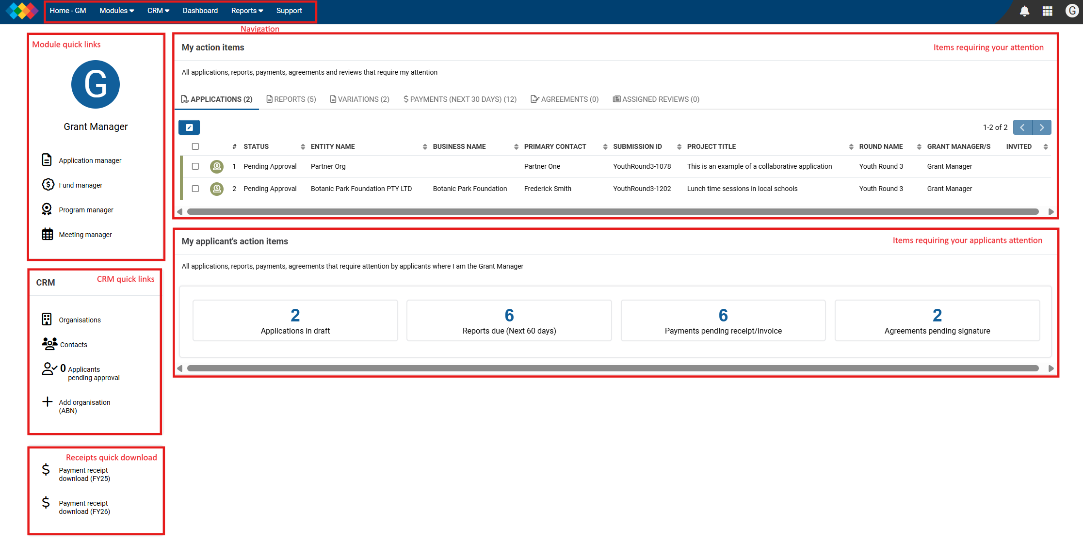My Applicants Action Items | This area has activities and applications that need action by applicants where you are the Grant Manager. This can enable you to contact applicants if they have overdue items or applications needing to be submitted. |