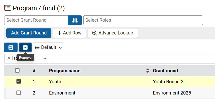 - Select the original grant round and the remove icon.